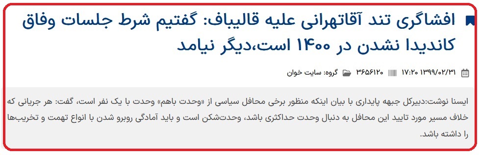 عصر ایران-سرخوردگی بدنه مردمی اصولگرایان از ائتلاف مصنوعی پایداری – قالیباف: تا دیروز علیه همدیگر افشاگری می کردند/ «اصولگرایی» یا «نان خوردن از اصولگرایی»؟