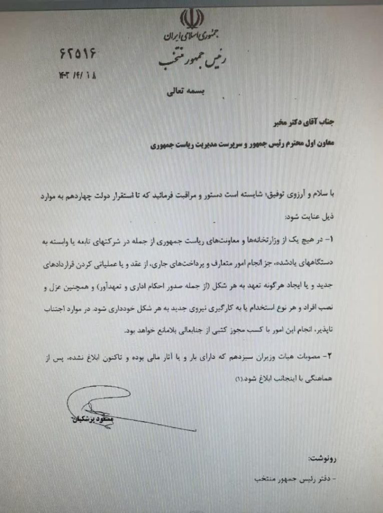 پزشکیان درنامه‌ای به مخبر از او خواست از عقد‌ و عملیاتی شدن قرارداد جدید و یا هرگونه عزل،نصب و بکارگیری نیرو جدید دردولت،جلوگیری شود.